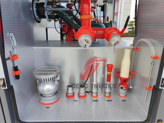 2. Снабдевање водом из резервоара за воду: Резервоар за воду од 10 кубних метара опремљен на возилу обезбеђује довољно воде за систем за гашење пожара. Ватрогасна пумпа црпи воду из резервоара за воду кроз цевовод и доводи је под притисак до монитора пожара или пиштоља за гашење пеном.