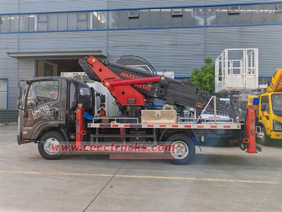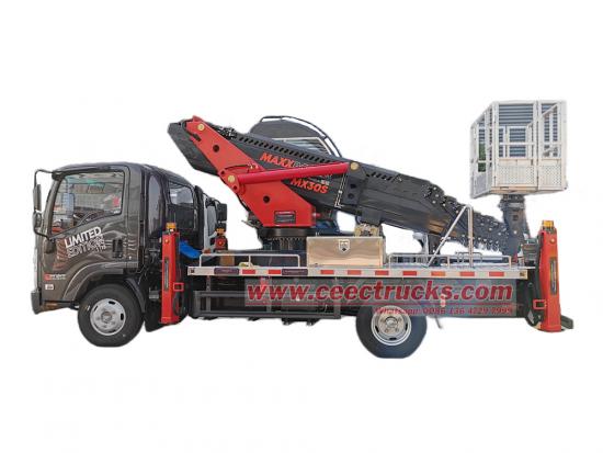 Возило за ваздушне радове Исузу КВ100 од 30 метара модификовано је на бази шасије Исузу КВ100, међуосовинско растојање од 3815 мм, укупна маса 8280 кг, опремљено је Исузу 4КХ1ЦН6ХБ Евро ВИ мотором од 132 КС, Исузу МЛД 6-брзинским мењачем, горњи део је 8-секциона 18-страна синхрона телескопска рука, максимална висина подизања је 30 метара, максимални радни радијус је 12 метара, цело возило је опремљено са четири хидрауличне телескопске ноге (телескопске горе-доле и хоризонталне телескопске) и укупно осам цилиндара, предњи X-тип, задњи H-тип, индивидуално подесиво, пумпа за хитне случајеве, ротација радне платформе од 360 степени, ограда од алуминијумске легуре, шарени ходник против клизања, номинално оптерећење кашике 200 кг, може се управљати помоћу окретне кабине, контролне кутије са земље, бежични даљински управљач.