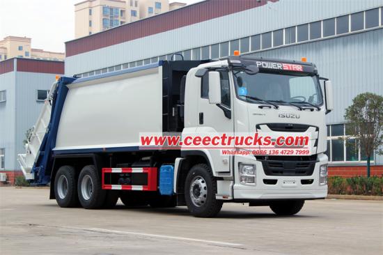 ТхеИСУЗУ ГИГА камион за смеће усваја напредни 12 предњих и 1 задњи мењач, у комбинацији са 6*4 погонском формом како би се обезбедила стабилност и ефикасност у сложеним условима на путу. Закривљено тело резервоара од 20 кубних метара је направљено од специјалног челика К235, са дебљином тела резервоара од 4 мм и целокупним процесом обликовања. Цомпглумац однос је чак 1:3,4, обезбеђујући крајњу ефикасност компресије смећа. Потпуно аутоматски хидраулички контролни систем има једно време циклуса пуњења и истовара од само 40-45 секунди, и опремљен је интелигентном контролом ПЛЦ-а, којом се лако и брзо управља. У ручном режиму, оператер може да користи ручицу за управљање и електрична контролна дугмад да заврши операције као што је компглумаци истовар простора за смеће.