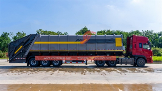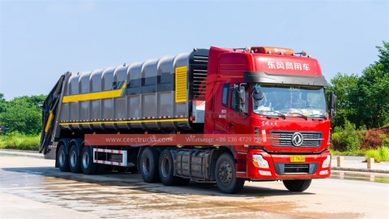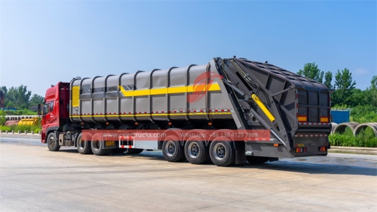 Реар Лоад 45ЦБМ Гарбаге компактор полуприколица (такође се зове компресија смећаполуприколица, компактор отпадаполуприколица, бацк лоад смећеприколица, компактор смећаполуприколица,задњи утоваривачполуприколица, приколица за смеће) је врста приколице која се користи за сакупљање, сабијање и транспорт чврстог отпада. Полуприколице за сабијање смећа су важан алат у системима управљања отпадом, омогућавајући ефикасно сакупљање, сабијање и транспорт чврстог отпада. Полуприколице са компактором за смеће великог капацитета 45ЦБМ могу смањити количину отпада и оптимизовати транспорт, доприносе чистијој и одрживијој животној средини.