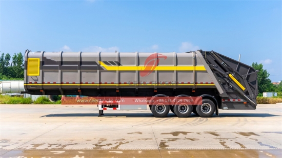 Полуприколица за компактор за смеће најбољег квалитета 45ЦБМ на продају, 3 осовине са БПВ, ФУВА бренд опционо, стандардне ЈОСТ ноге за слетање, горњи део тела од угљеничног челика, са свим бојама и логотипима зависе од захтева.