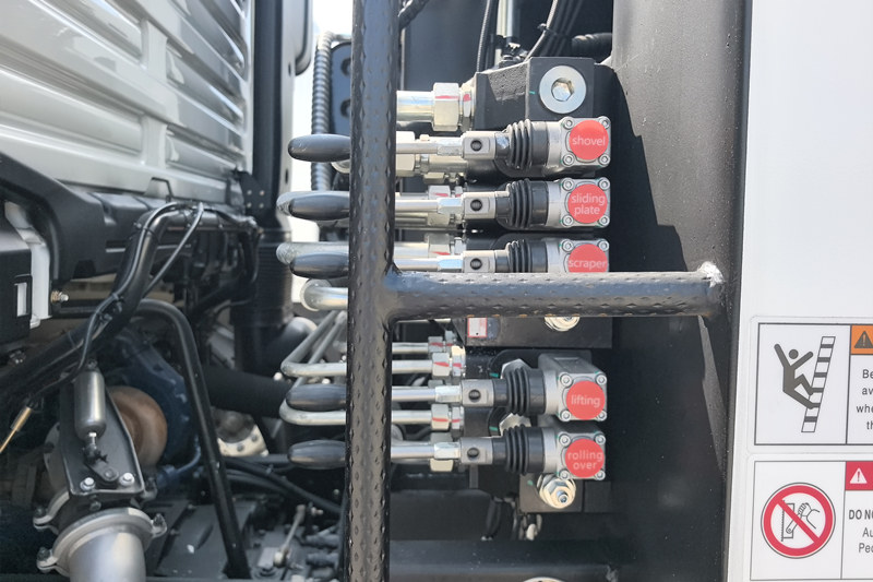 ● Шацманов камион са задњим утоваривачем користи електрохидрауличне контролне вентиле и PLC програмабилни систем управљања, комбинујући предности електронске и хидрауличне контроле. Ова интегрисана електрохидраулична контрола ефикасно решава проблеме интерфејса између хидрауличног и електричног система, побољшавајући поузданост рада.